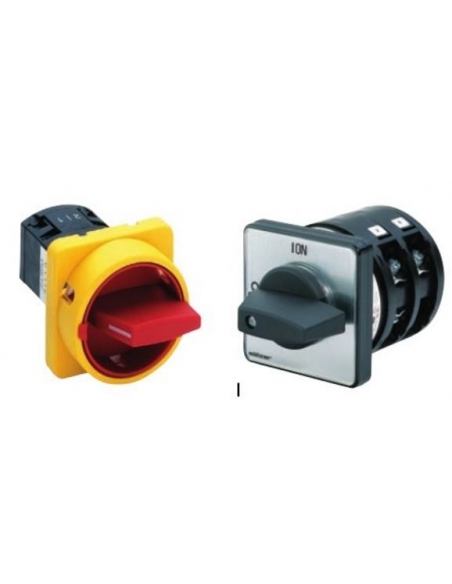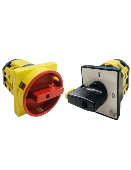 Interruptor rotatorio de levas, interruptor principal trifásico 20 A. 0-I, con accionamiento amarillo-rojo, bloqueable en posición O. Aptos para interrupción, conexión y conmutación de circuitos eléctricos asi como arranque directo de motores e interruptor principal en maquinas.