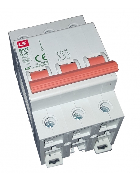 Magnetotérmico 3 polos 20A Curva C, para protección contra cortocircuitos y sobrecargas en instalaciones trifásicas. Con un poder de corte asignado de 6000A. Modelo: BKN 3P C20A.