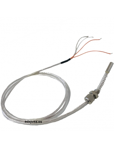 Sonda de temperatura PT100, termoresistencia RTD a 3 hilos, adecuada para el control de temperatura en, usos generales, sensor de Ø5x50mm. y con una longitud de cable de 2m. Dimensiones: Ø5x50mm. Rango de temperatura: -50..+300ºC. Tipo: 3 hilos.