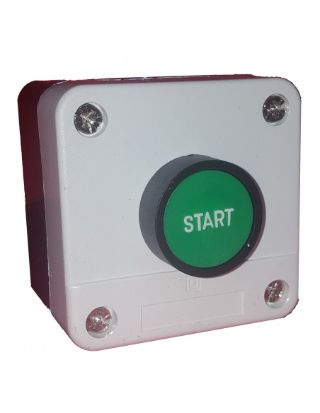 Caja con pulsador de marcha (start) color verde completa. Caja con pulsador de marcha (start) completa. Caja fabricada y pulsador fatricadá en plástico color blanco-negro. El suministro incluye el pulsador completo, caja y un contacto abierto, todo ello montado.