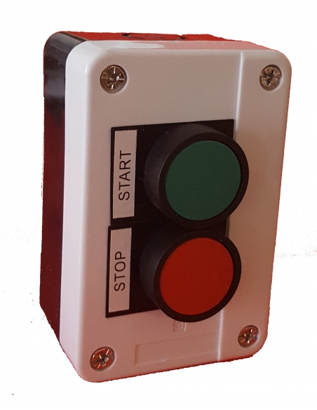 Caja con pulsadores de marcha (start) y paro (stop) completa. Caja fabricada y pulsador fabricada en plástico color blanco-negro. El suministro incluye: Pulsador completo color verde. Pulsador completo color rojo. Contacto abierto. Contacto cerrado. Caja en plástico para 2 elementos. La botonera se suministra montada.