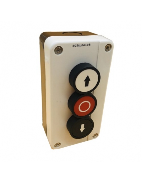 Caja con pulsador de paro (stop) ADJ-e color rojo completa. Caja con pulsador de paro (stop) completa. Caja fabricada y pulsador fatricadá en plástico color blanco-negro. El suministro incluye el pulsador completo, caja y un contacto cerrado, todo ello montado.